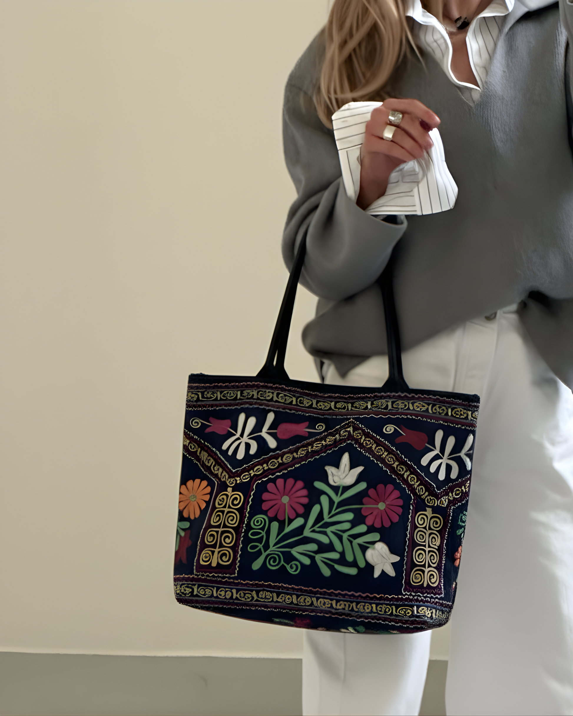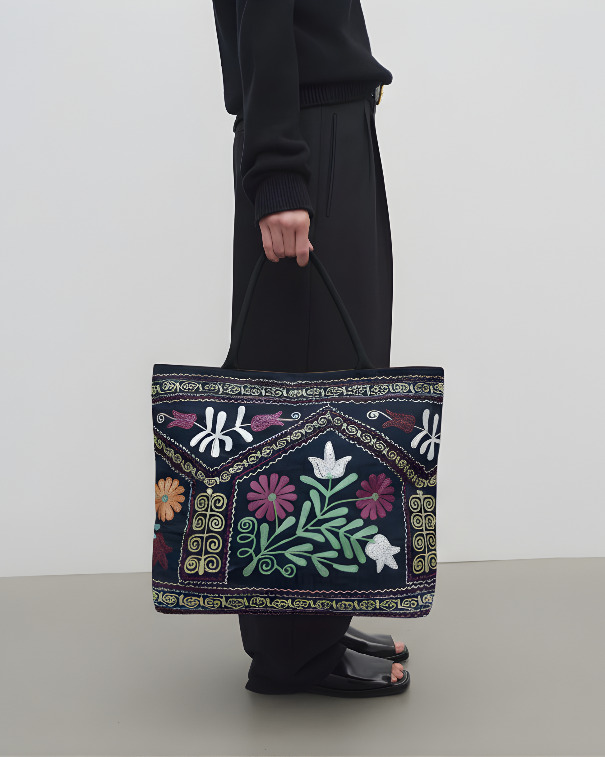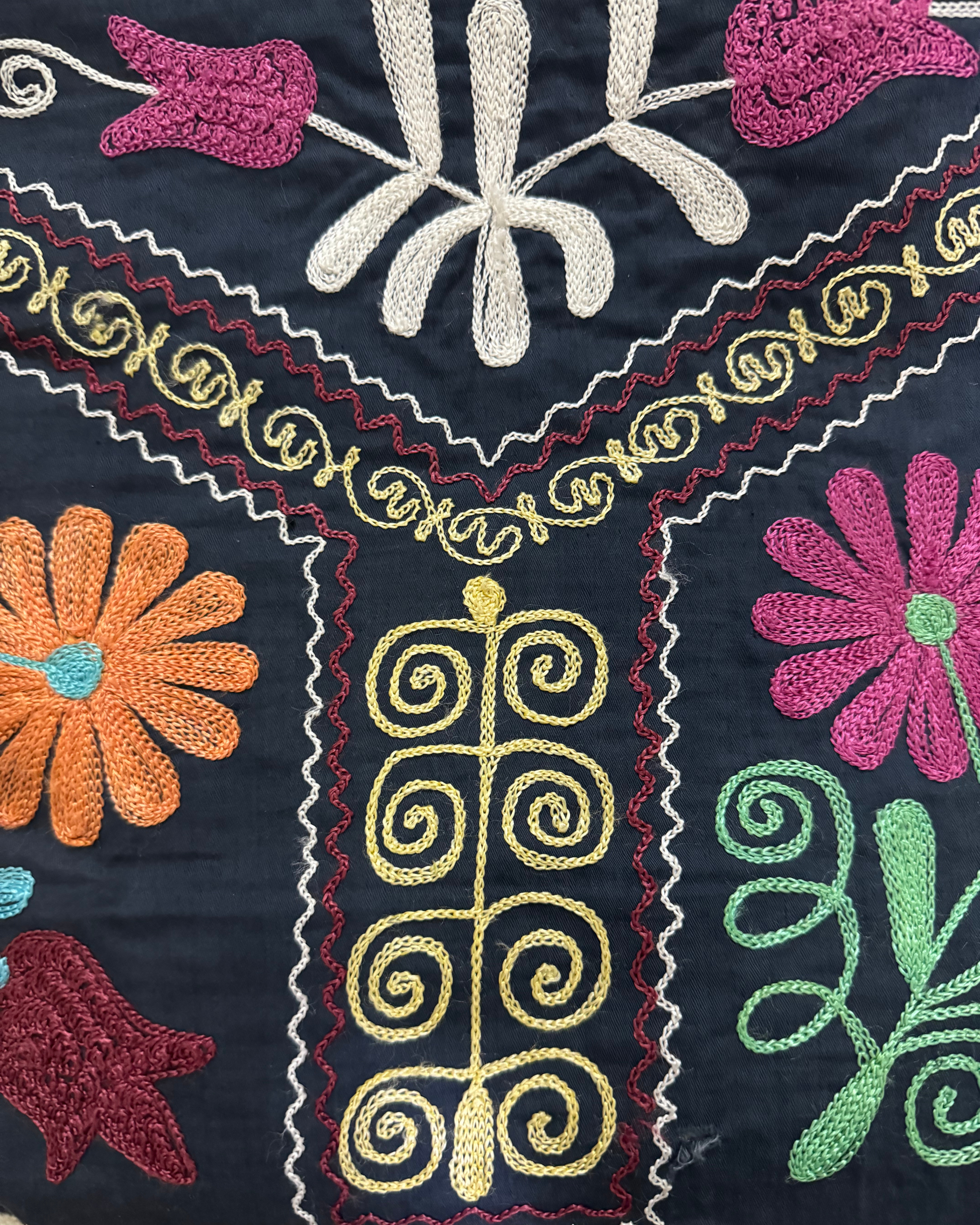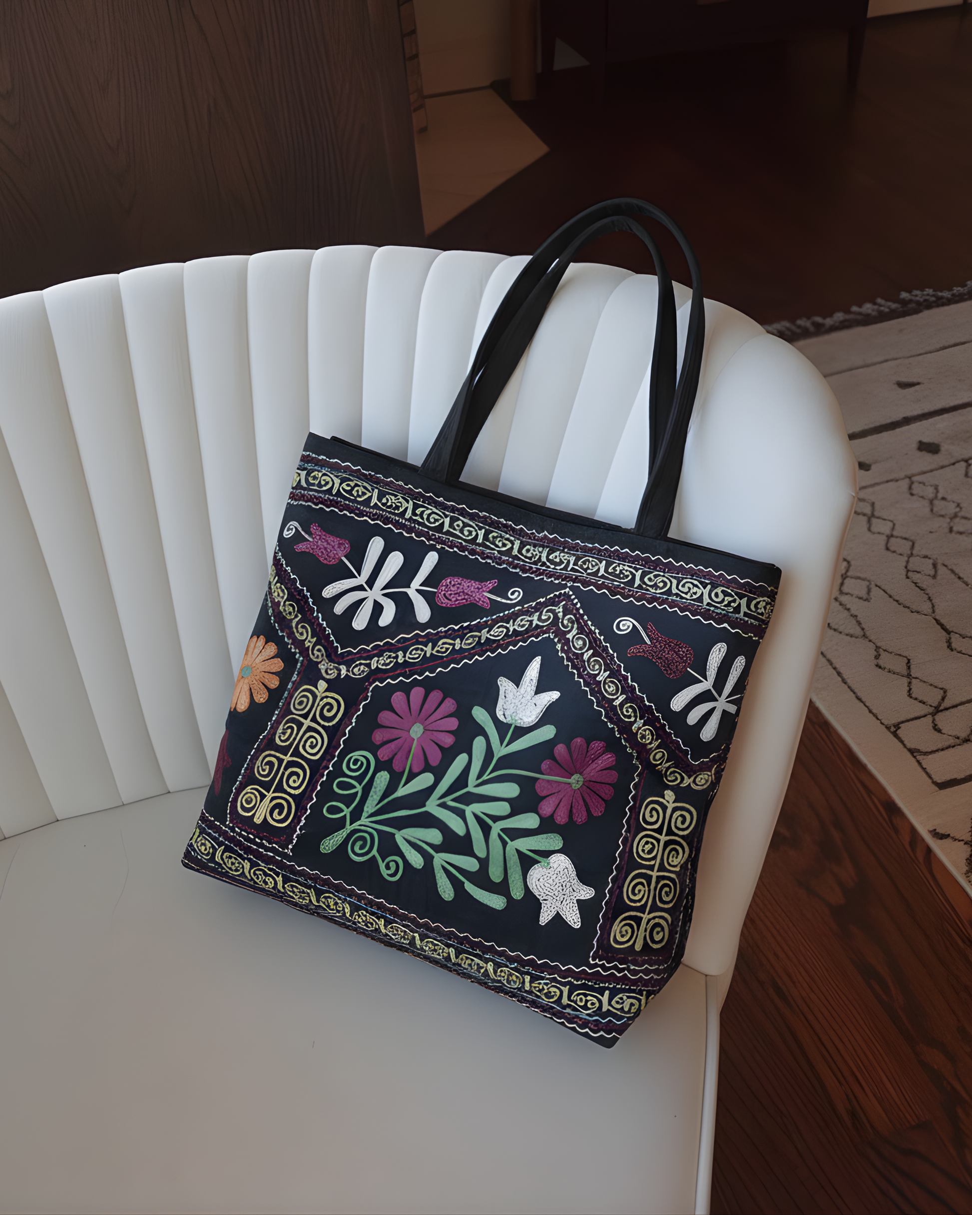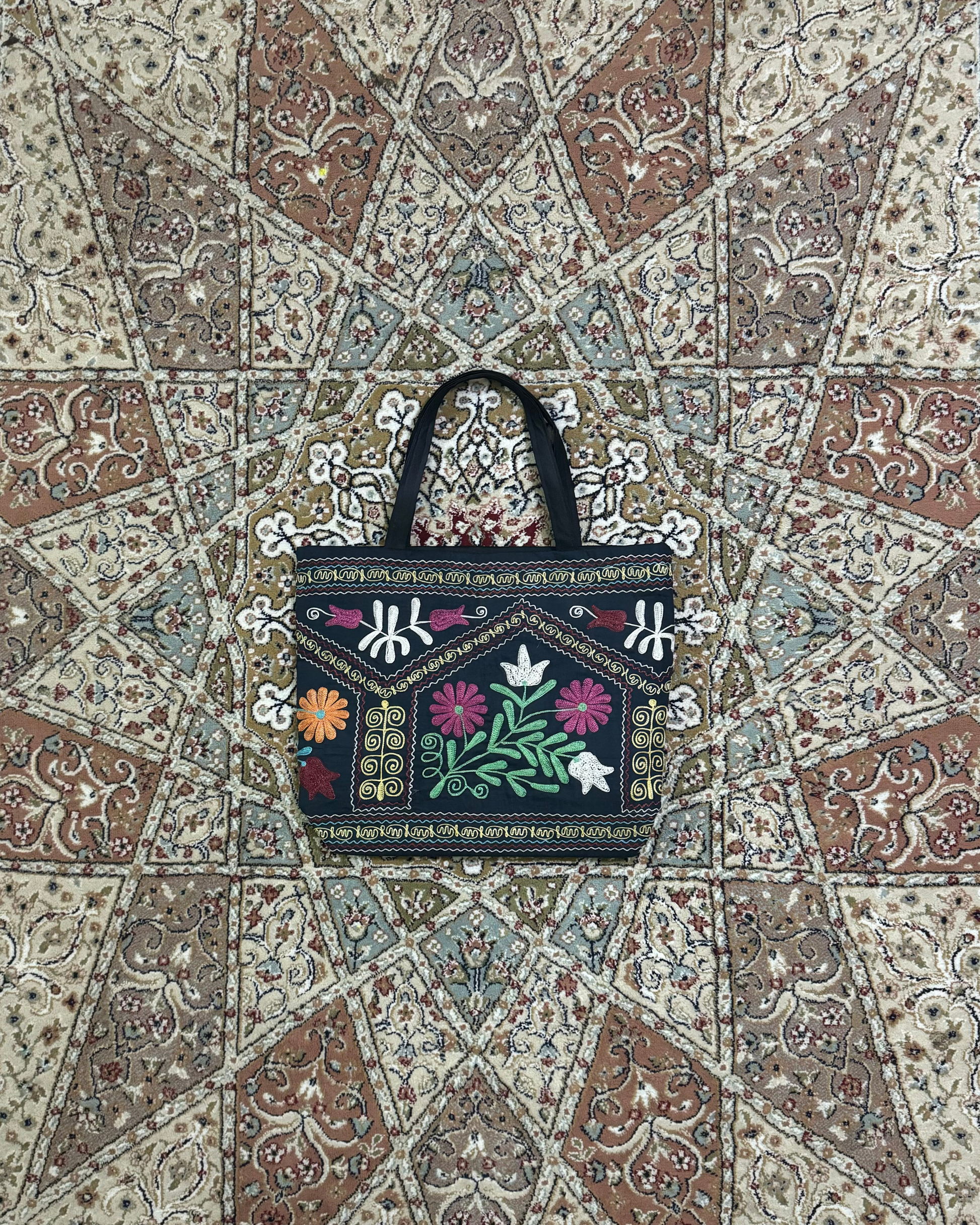 Handcrafted from premium vintage suzani textiles, this tote is a one of a kind piece that carries history, color, and meaning. The intricate embroidery is made using traditional techniques, featuring a central floral bouquet flanked by architectural borders and delicate scrolling vines.
